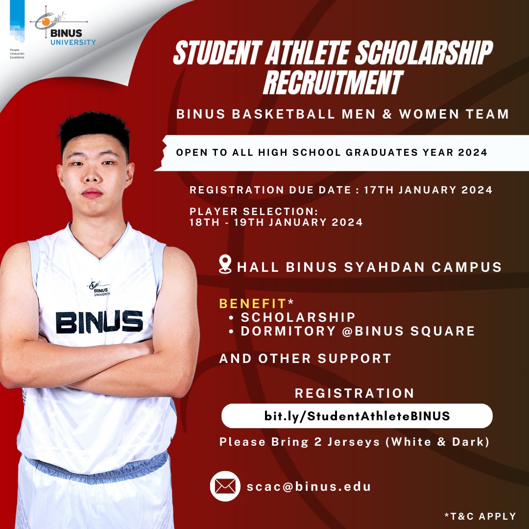 “Student Athlete Scholarship – BINUS Basketball” merupakan salah satu program beasiswa BINUS UNIVERSITY yang diberikan kepada siswa/i SMA atau sederajat yang memilki keahlian dan prestasi unggul di bidang basket untuk berkuliah di BINUS UNIVERSITY khusus nya di Kampus BINUS Greater Jakarta tanpa dikenakan biaya hingga masa studi berakhir.